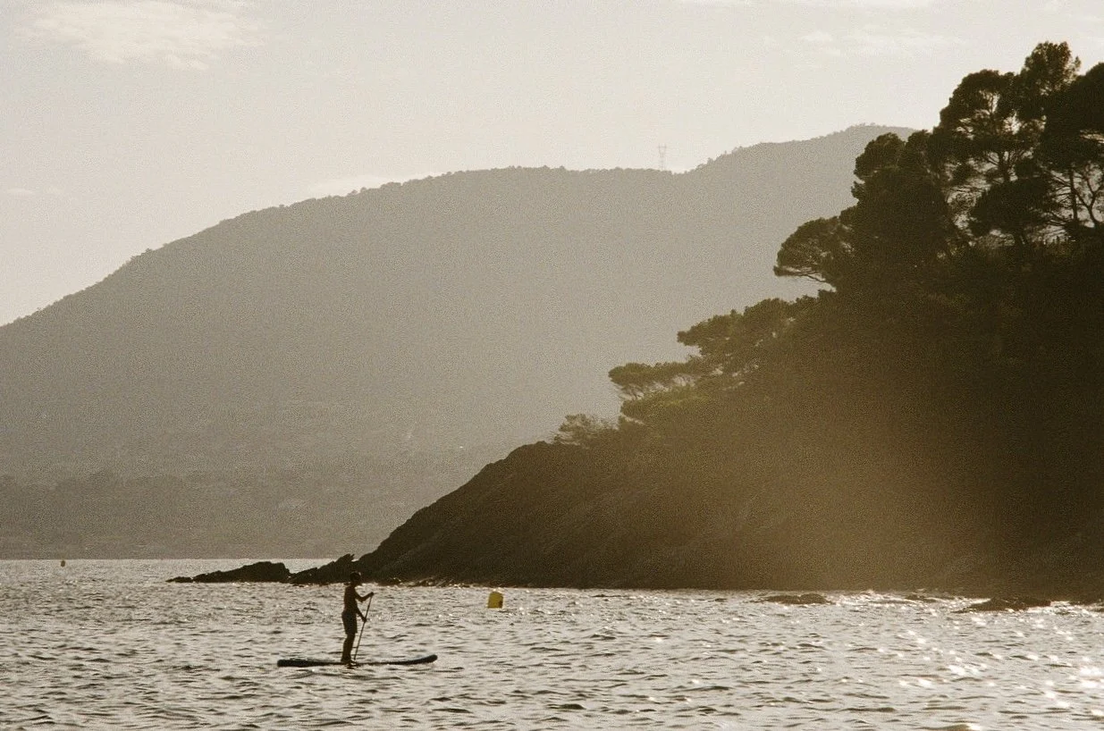Une personne fait du paddle sur une étendue d'eau calme, entourée de collines et d'arbres, sous un ciel nuageux au coucher du soleil.