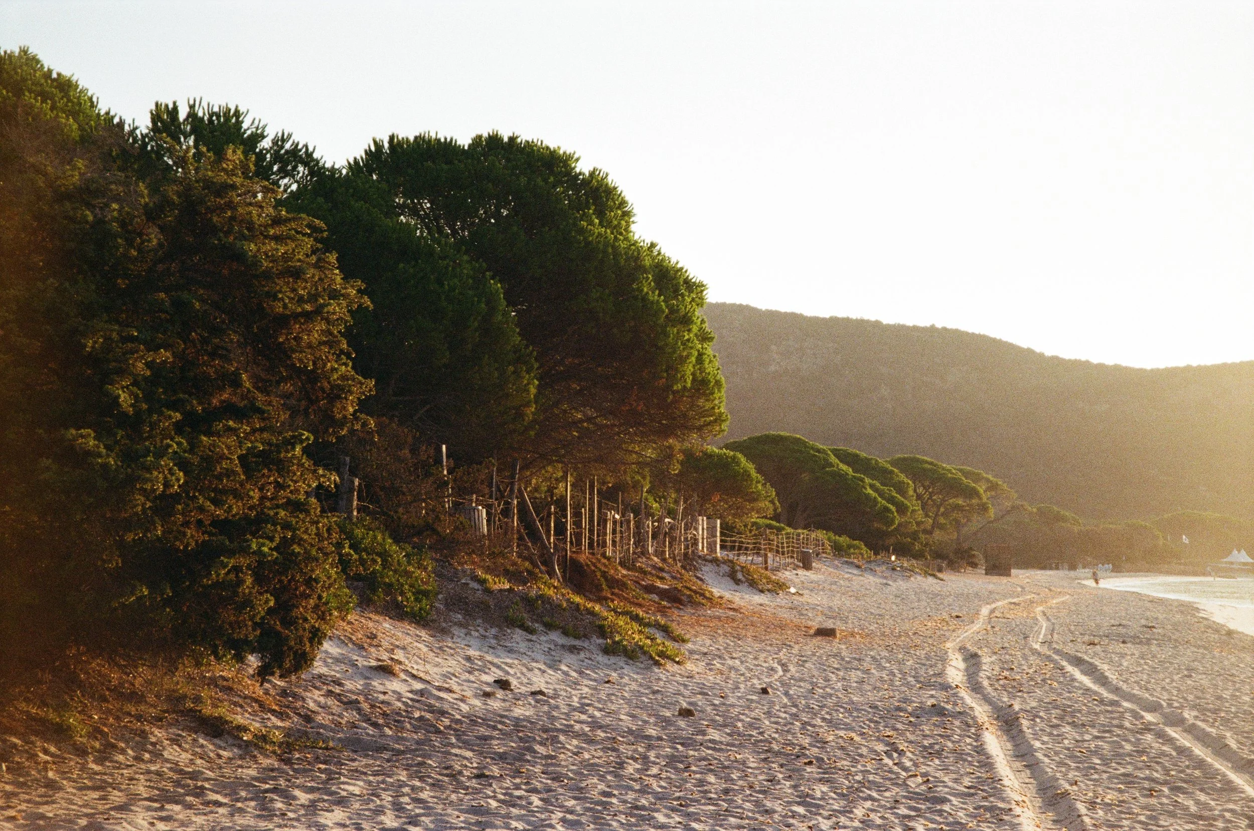 Plage de sable avec des traces de pas, des arbres verts et un chemin le long de la côte, sous un ciel clair en fin d'après-midi.