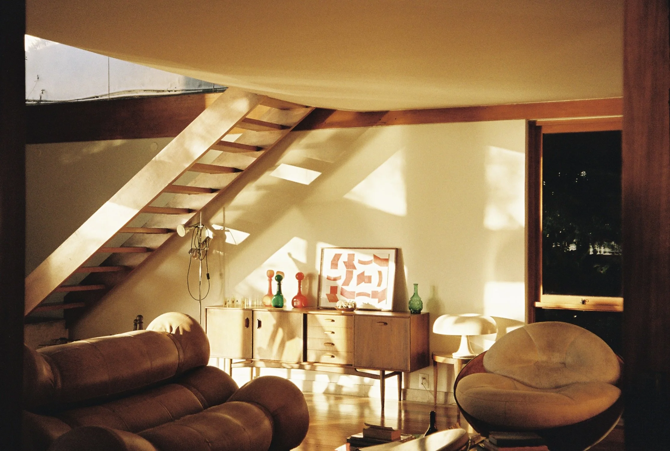 Intérieur d'un salon avec des meubles en bois, un canapé en cuir, un lustre moderne, et des décorations colorées, éclairé par la lumière du soleil en soirée.