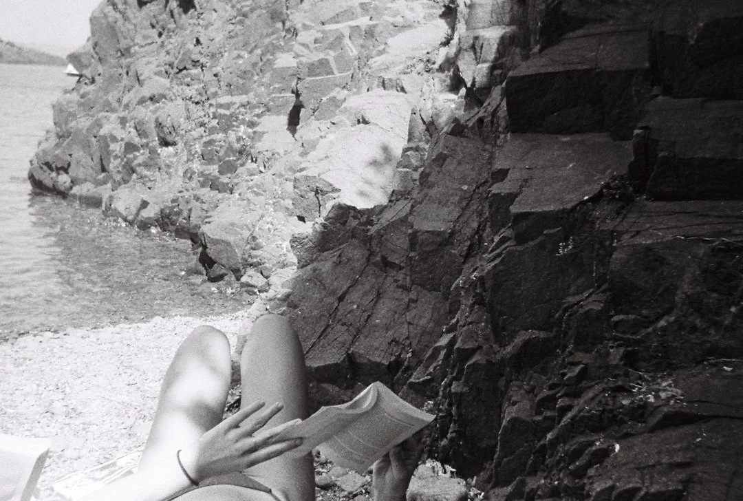 Personne en maillot de bain lisant un journal sur une plage rocheuse.