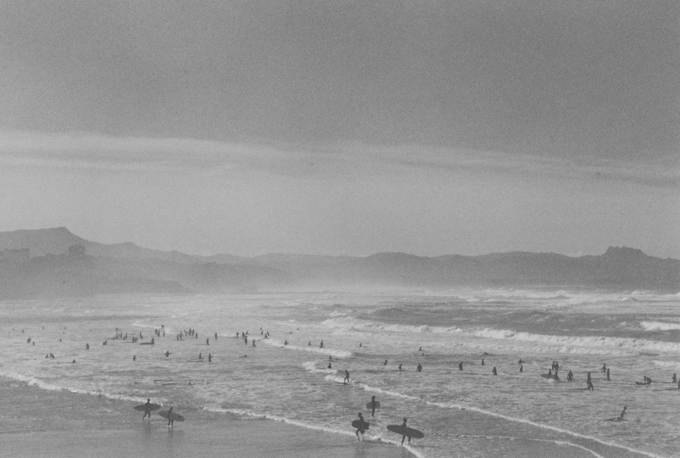 Des surfeurs dans l'océan avec des vagues en arrière-plan et des montagnes à l'horizon en noir et blanc.