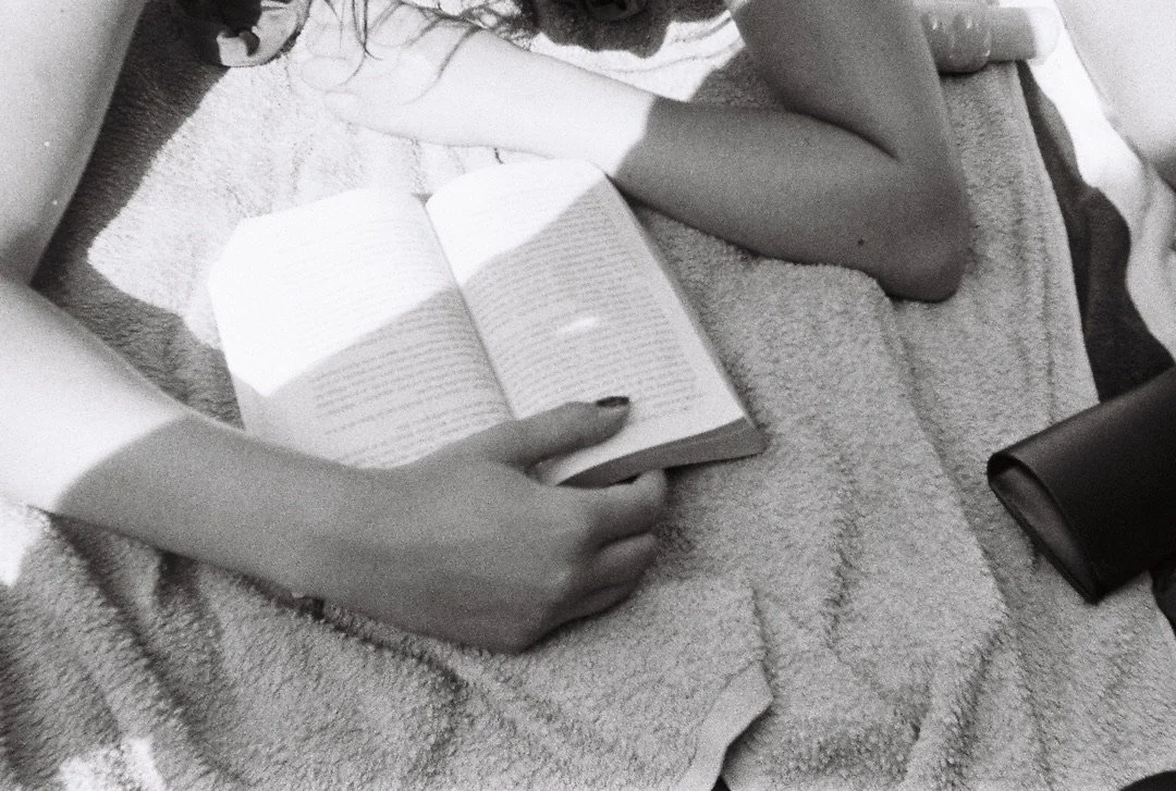 Personne lisant un livre allongée sur une serviette. Voir en taille réelle
