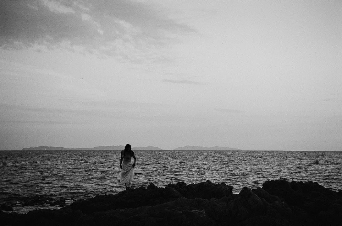 Personne en robe blanche debout sur des rochers face à la mer avec un ciel nuageux. Voir en taille réelle