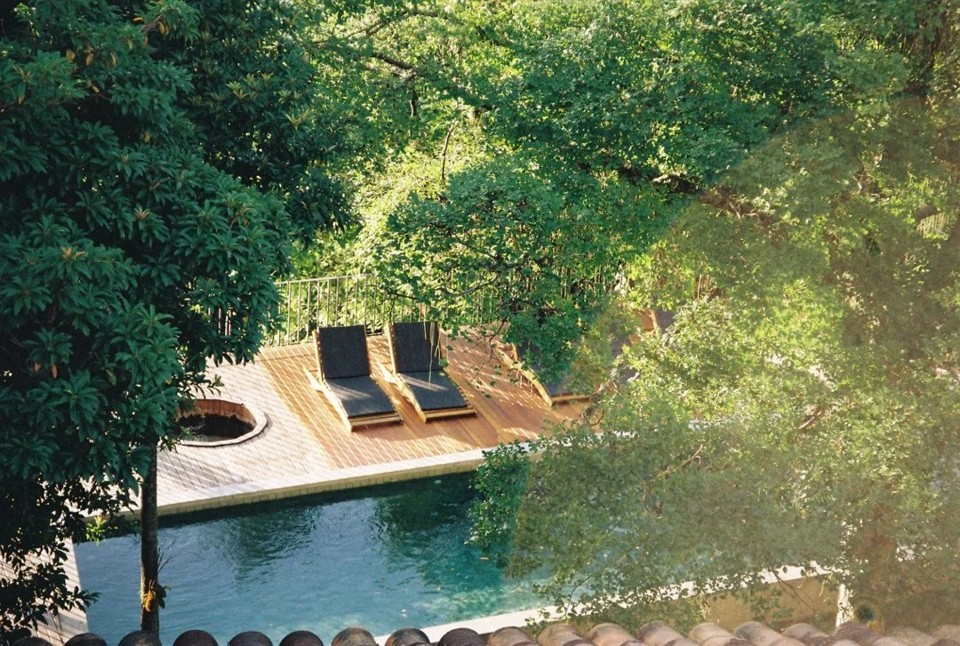Une piscine entourée d'arbres et de chaises longues en bois avec matelas noir.